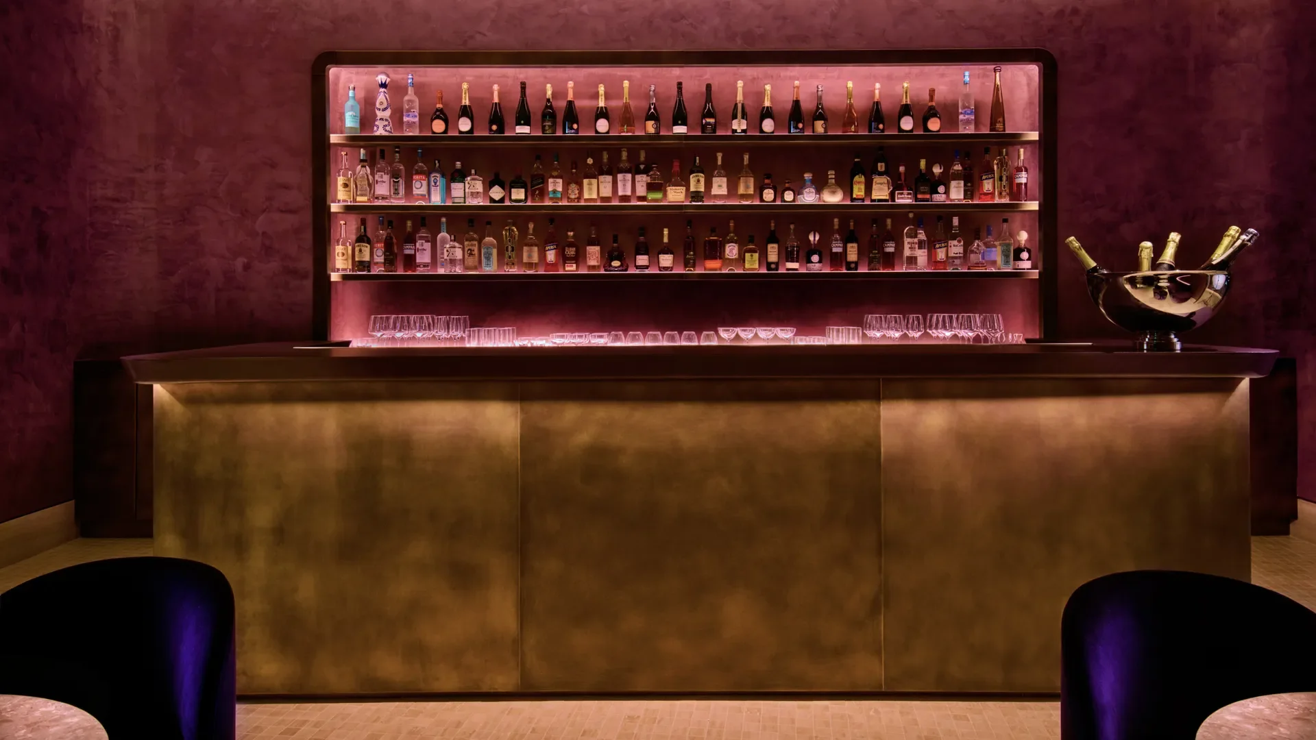 The gem-like Plum Bar, Peach Dining and Mint Lounge are named for their hand-applied colour plaster wall finishes, and are inspired by Moroccan hurricane lamps. Peach Dining is home to a marble dining table, a cloud chandelier by Apparatus Studio and a cabinet emblazoned with a digitally-printed floral pattern by Driade Lab. Plum Bar is a jewel box space where bottles are kept in a glowing niche and the banquets and armchairs are clad in sumptuous velvet. The Mint Lounge is also velvet-clad, this time in fresh green, and also boasts gorgeous geometric alabaster block wall lamps designed by Pierre Chareau in 1923. The cinema is also worth a mention, kitted out with Roche Bobois Mah Jong seating.